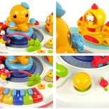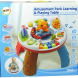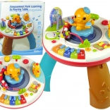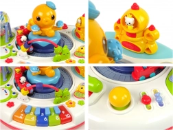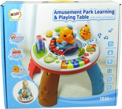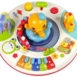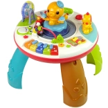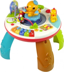 De tafel is uitgerust met een klavier met melodieën, draaibare figuurtjes en verlichte knoppen in de vorm van dieren, die bij het indrukken vrolijke geluiden en lichteffecten geven. De kunststof tafel is ontworpen om moeiteloos de aandacht van het kind te trekken.
