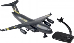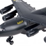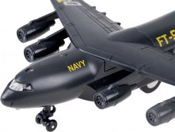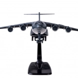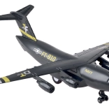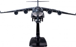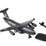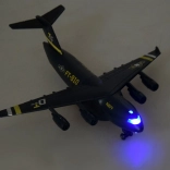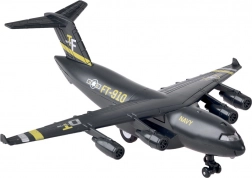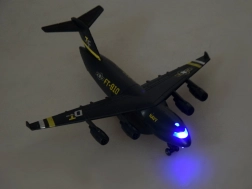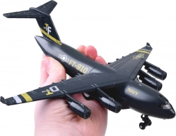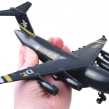 Dit model van een militair transportvliegtuig is zorgvuldig ontworpen met een zwarte kleur en gouden en zilveren accenten. Het is uitgerust met een terugtrekmechanisme en geluidseffecten, wat voor plezier zorgt en de ontwikkeling van de verbeelding van kinderen stimuleert.