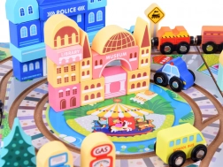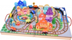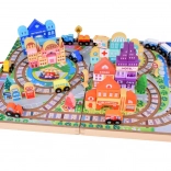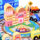 Ontdek de fascinerende wereld van houten constructies met deze houten stedenbouwset, die 89 elementen van plezier biedt. De set bevat sporen, batterijtreinen en verschillende kleurrijke blokken om unieke gebouwen te bouwen.
