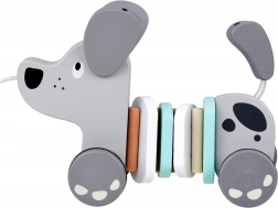 Het houten hondje heeft beweegbare oortjes en een staart, wat het spel dynamiek geeft.