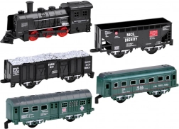 De trein wordt aangedreven door twee AA-batterijen, die niet bij de verpakking zijn inbegrepen. De set bevat de locomotief, vier wagons en een set rails, verpakt in een aantrekkelijk gekleurd cadeaupakket, ideaal als geweldig cadeau.