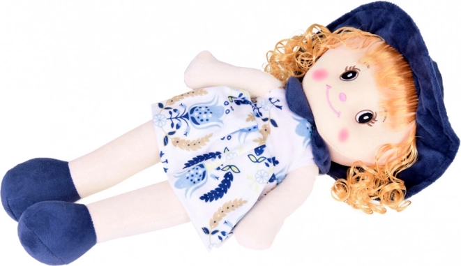Deze pop is volledig gemaakt van een zacht, aangenaam aanvoelend materiaal. Ze draagt een geplisseerde jurk met bloemmotief, die qua kleur is afgestemd op de schoenen, kraag en hoed. Haar haar is krullend en blond. Ogen, wenkbrauwen, glimlach en neus zijn geborduurd, waardoor ze geen kleine onderdelen bevat die tijdens het spelen kunnen losraken.