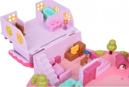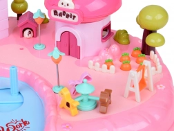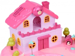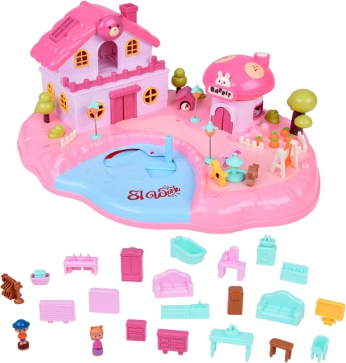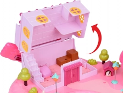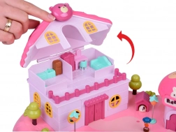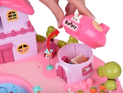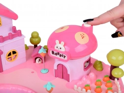 Het huis biedt een meerniveaus interieur met scènes voor alledaags spel: een knusse slaapkamer met bed, een kast die open kan, een badkamer met bad en wastafel, een keukentje met koelkast en een kaptafel. Licht- en geluidseffecten geactiveerd met knoppen versterken de spelsfeer, en de verlichte tekst RABBIT reageert op het ritme van de melodie.