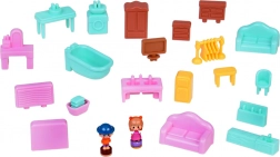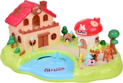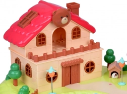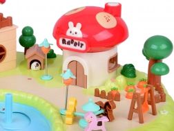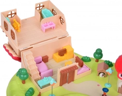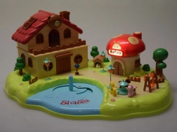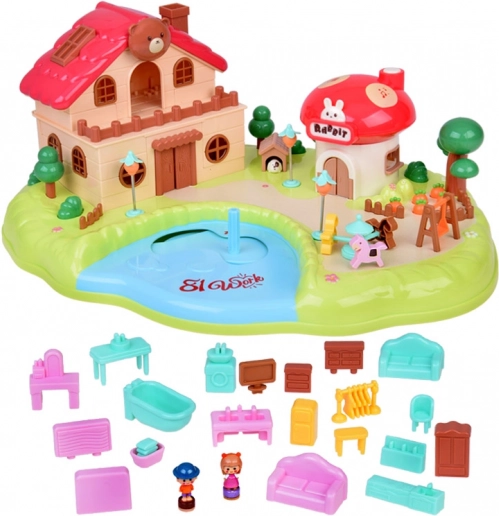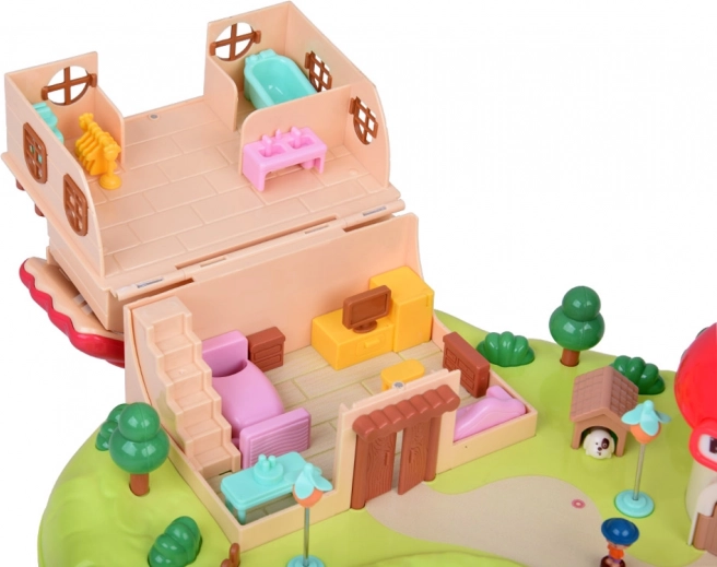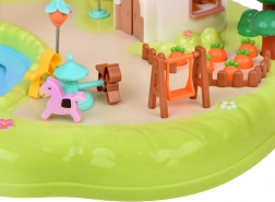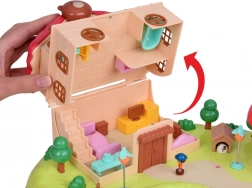 Slaapkamer met te openen kast, badkamer met bad en wasmachine, keuken met koelkast en een kamer met kaptafel. Buiten wacht een speelplaats met een draaimolen en schommel en een winkeltje in de vorm van een paddenstoel.