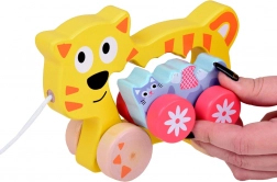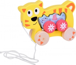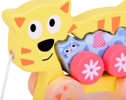 Dit houten trek-kattengezinnetje is de ideale metgezel voor de eerste stapjes. De grotere kat heeft een opening in het lichaam voor makkelijke grip, een bevestigd koord en stabiele wielen. Het kleinere katje volgt trouw, wat kinderen plezier in beweging geeft en hun natuurlijke nieuwsgierigheid versterkt.