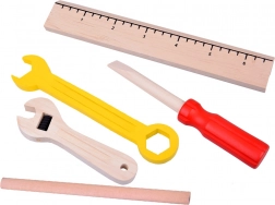 Hamer, zaag, tang, schroevendraaier, sleutels, liniaal en andere onderdelen bootsen echt gereedschap na en blijven tegelijk veilig voor kinderspel.