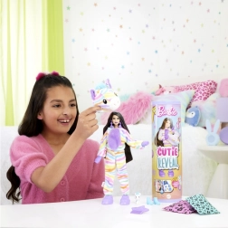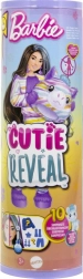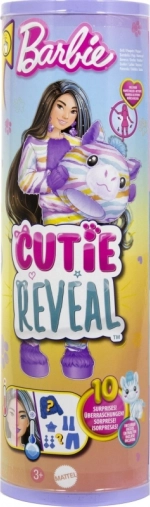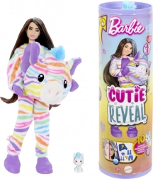 Ontdek een wereld vol verrassingen met de BARBIE Cutie Reveal-pop in een regenboogzebra kostuum. Na het verwijderen van het zachte pluchen pak verschijnt een stijlvolle pop met leuke accessoires, een tweekleurig modieus jasje en een water-geactiveerde look. Inclusief een schattig mini-diertje en een kam-sponsje voor magische kleuronthullingen.