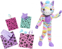 De BARBIE Cutie Reveal-pop uit de serie “Zoete dromen” combineert een zacht pluchen kostuum met modieus speelplezier. Het kleurrijke zebrapak verander je in stijlvolle outfits – inclusief een omkeerbaar jasje met bloemendessin en regenboogzebra-effect. In de verpakking vind je ook schoenen, shorts en sieraden voor eindeloos mixen en matchen.