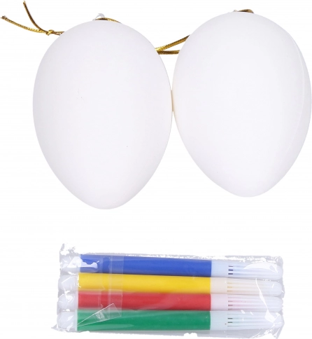 Creatieve set voor kinderen en volwassenen: twee plastic eieren om te kleuren met afmeting 5 × 8 cm, aangevuld met 4 gekleurde stiften. Ideaal voor paasdecoratie, knutselen en het ontwikkelen van de verbeelding.