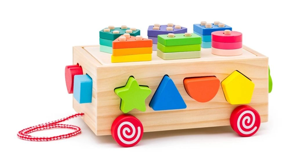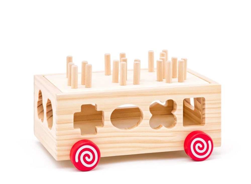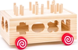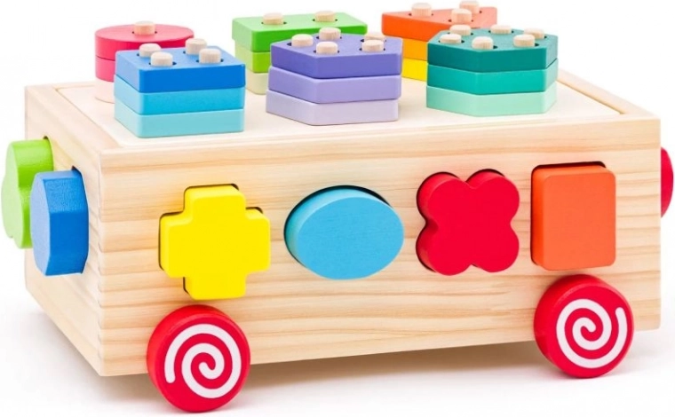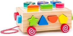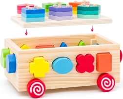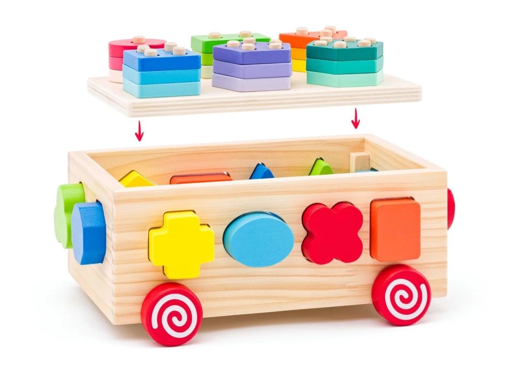 Deze houten kar is een ideale speelgoedoptie voor jonge kinderen en combineert plezier met leren. De kar biedt vormherkenning en ontwikkeling van de fijne motoriek dankzij de kleurrijke geometrische vormen die kinderen in de bijbehorende openingen kunnen plaatsen.
