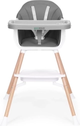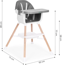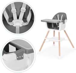 Dankzij het doordachte ontwerp zorgt hij voor een veilige en comfortabele zithouding. De 5-punts gordel zet het kind betrouwbaar vast, het verstelbare dienblad met 3 posities is gemakkelijk uit te nemen en te reinigen, verhoogde randen en een bekerhouder voorkomen morsen. De bekleding van duurzaam eco-leer is eenvoudig schoon te maken, anti-slip doppen beschermen de vloer en voorkomen verschuiven van de stoel. Het praktische rek onder de zitting biedt plaats aan slabbetjes of doekjes en verhoogt tegelijk de stabiliteit.