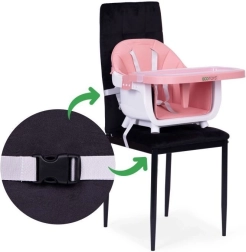 2 gebruikswijzen – thuis en onderweg: De hoge stoel kan in een handomdraai worden omgevormd tot een zitje dat op een standaardstoel wordt bevestigd. Na het verwijderen van de poten bevestigt u de zitting met de meegeleverde riemen – de ideale oplossing voor vakanties, bezoeken en kleine keukens.