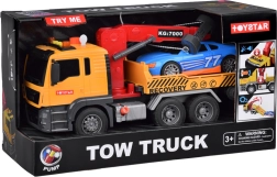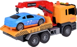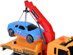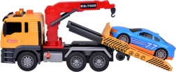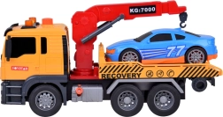 De set bevat ook een sportieve blauwe auto die perfect op de sleepwagen past. Het hele speelgoed is uitgevoerd in realistische kleuren - geel, grijs, rood en blauw.