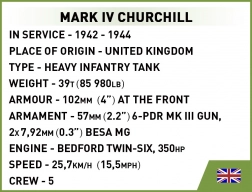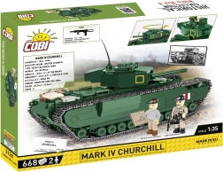Bouw de legendarische Britse zware infanterietank MARK IV CHURCHILL op schaal 1:35 uit 668 hoogwaardige onderdelen van COBI. Het model biedt werkende rupsbanden, een draaibare toren, een beweegbaar kanon en een te openen luik. Inclusief 2 gedetailleerde minifiguren met veel accessoires en hoogwaardige prints die niet vervagen. Ideaal voor liefhebbers van geschiedenis en bouwsets.