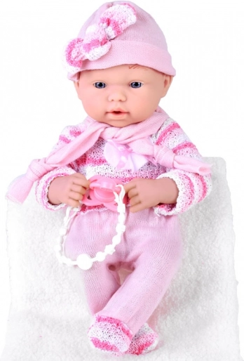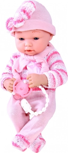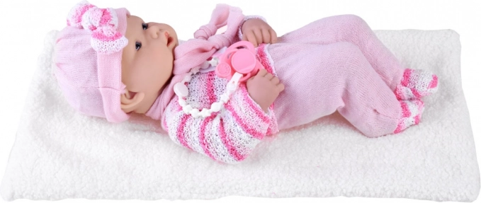 Het gedetailleerde gezicht, de fijne gelaatstrekken en het roze gebreide setje met muts zorgen voor een natuurlijke en tedere uitstraling die kinderen uitnodigt om te knuffelen en te verzorgen.