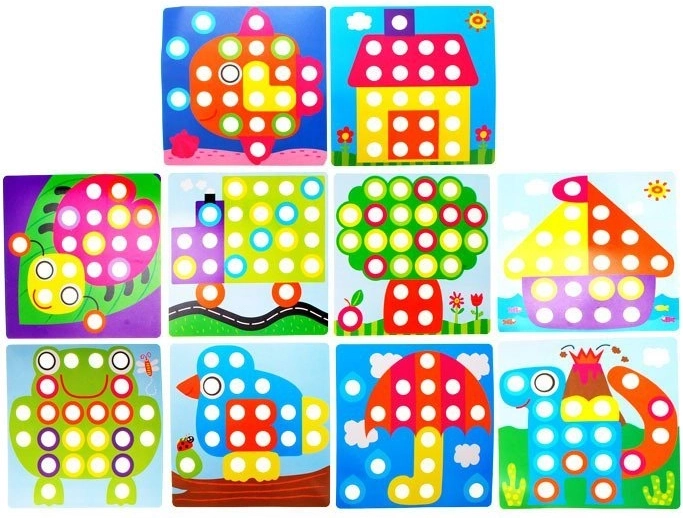 Kinderen leggen kleurrijke afbeeldingen met gekleurde pinnen, trainen hun greep, precisie en oog-handcoördinatie en ontwikkelen hun fantasie.
