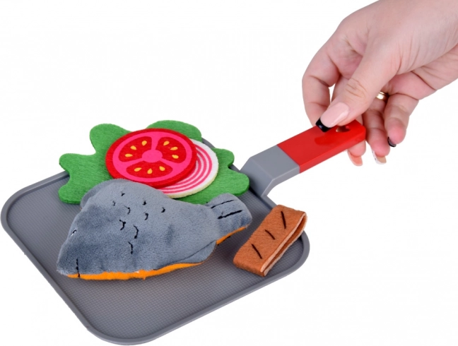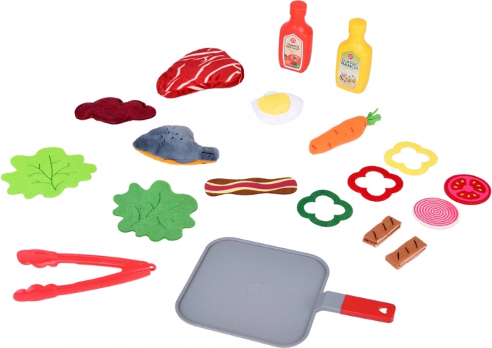 Ontdek creatieve keukenpret met de zachte kookset voor kinderen. Kleurrijk textielvoedsel en plastic keukengerei stimuleren de verbeelding, fijne motoriek en gezonde gewoonten. In de set vind je een pan en tang, stukken zoals steak, vis, kipfilet en kipstrips, en favoriete ei, spek, groenten en sauzen – alles veilig en prettig aan te raken.