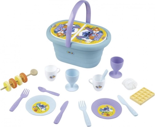 Geniet van de magie van een picknick met STITCH! Deze lichte en gemakkelijk draagbare kinder picknickmand met ergonomisch handvat bevat 19 stuks accessoires voor leuk rollenspel in koken en serveren. Het kleurrijke servies en de accessoires zijn ideaal voor het stimuleren van de fantasie, het delen van snacks en spelen met vriendjes.