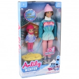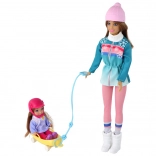 Ontdek de magie van de winter met mama en dochter op de slee. De grote pop heeft lang bruin haar en een warme muts, de kleine pop draagt een roze helm voor extra veiligheid. Pastelkleurige winteroutfits met sneeuwvlokken versterken de sfeer van besneeuwde avonturen en de gele slee nodigt uit tot eindeloos glijden.
