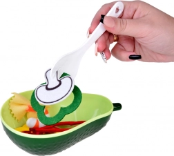 De kom is ontworpen in de vorm van een avocado met realistische details en kan door kinderen worden gebruikt om plastic ingrediënten te serveren. Dit ondersteunt rollenspel als kok en verruimt de kinderlijke fantasie.