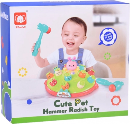Het spel Sla met het hamertje biedt kinderen de mogelijkheid hun motorische vaardigheden te ontwikkelen in een leuke omgeving. Op het kleurrijke platform dat op een weide lijkt, staan worteltjes in verschillende kleuren en met verschillende gezichtsuitdrukkingen, samen met een roze konijntje dat bij een hamerslag omhoog springt. Het spel wordt begeleid door een vrolijke melodie die de aandacht van kinderen trekt. Het platform heeft twee niveaus met worteltjes en een ingenieus mechanisme dat, wanneer je het konijntje draait, ervoor zorgt dat er een andere wortel uit het bovenste niveau omhoog komt.