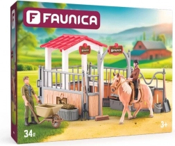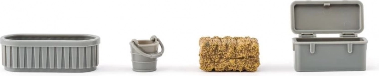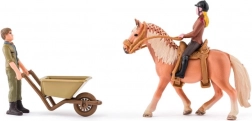 In de set vind je alles voor de verzorging van het paard: omheining/afdak, een paard met ruiter, een boer met kruiwagen en kleine accessoires. De afmetingen van het paard, 12 × 10 cm, zijn ideaal voor kinderhanden.