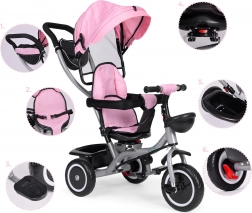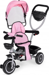 Afhankelijk van de leeftijd kun je onderdelen (kap, beugel, duwstang) eenvoudig verwijderen en de driewieler aanpassen aan de vaardigheden van het kind. Praktische mandjes en een vak met rits bieden ruimte voor speelgoed, een fles en kleine reisbenodigdheden.