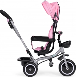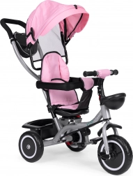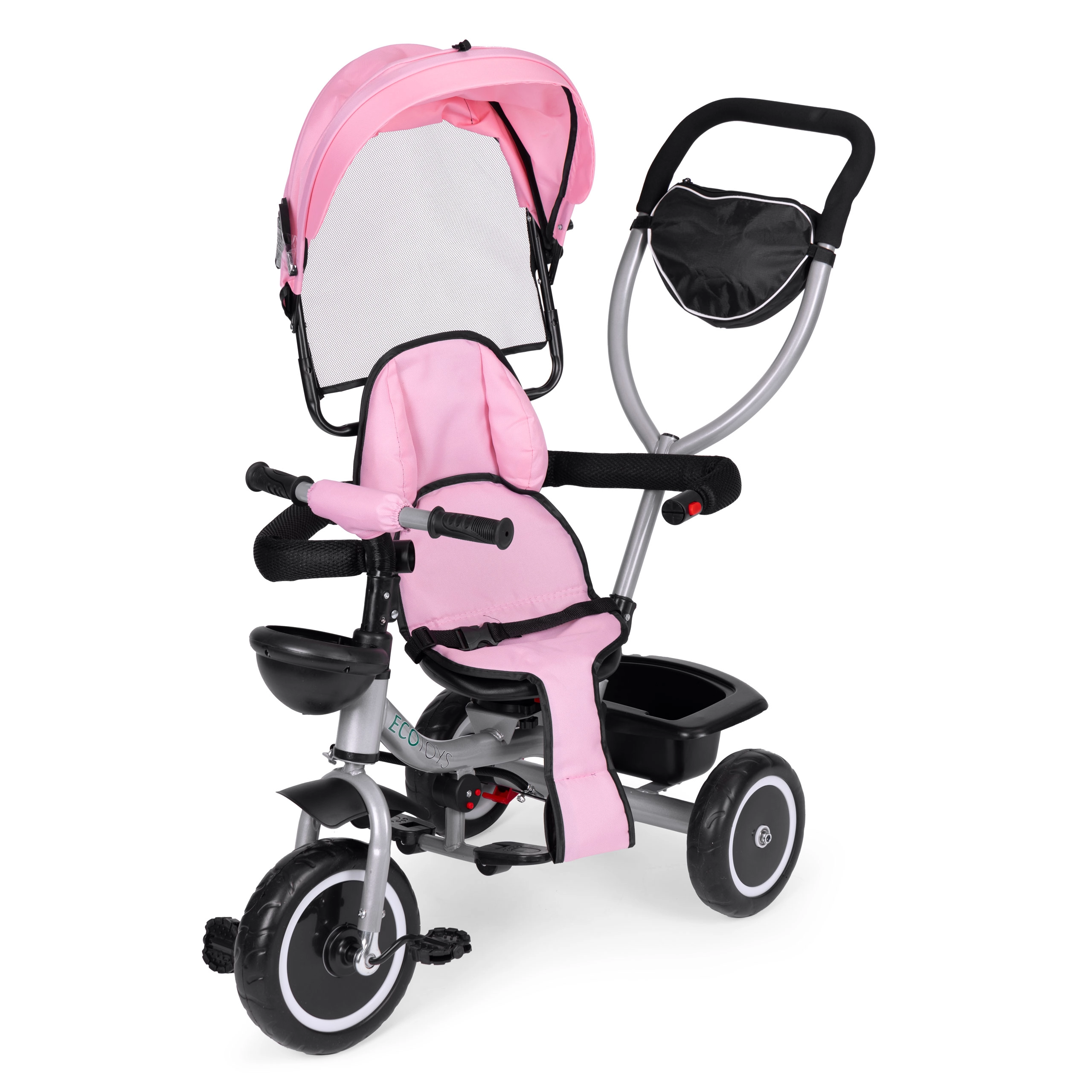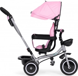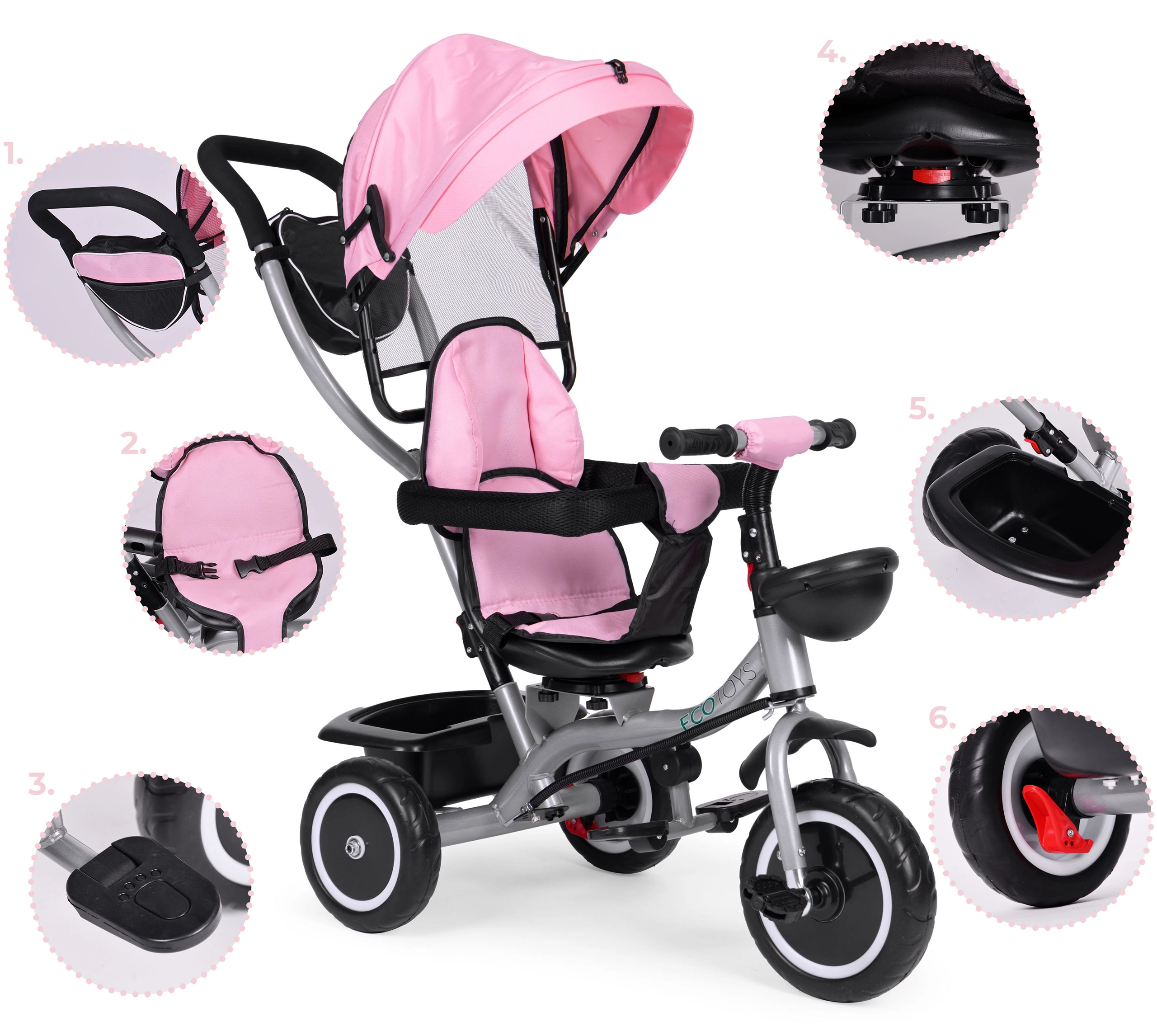 Deze multifunctionele driewieler combineert het comfort van een kinderwagen met het plezier van de eerste ritjes. Dankzij de draaibare zitting kan het kind naar de ouder kijken of in de rijrichting zitten. De inklapbare kap beschermt tegen zon, wind en lichte regen, en de ouderduwstang biedt volledige controle over de richting.
