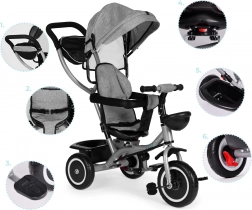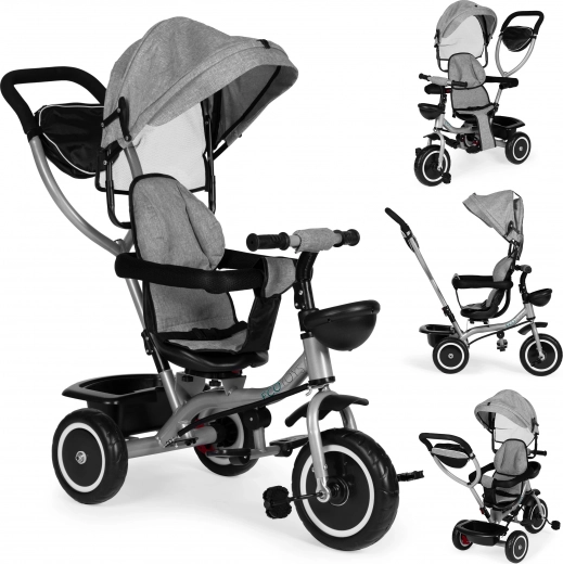 De ECOTOYS driewieler groeit met uw kind mee – van de eerste ritjes met oudergeleiding tot zelfstandig trappen. De draaibare zitting maakt rijden naar de ouder toe of in de rijrichting mogelijk, de opvouwbare kap beschermt tegen zon en wind en de vijfpuntsriemen met beugel zorgen voor zekerheid op elk oppervlak.