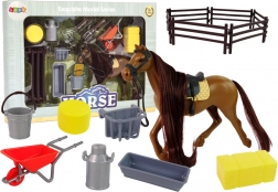 Paard met zadel en hoofdstel, omheining, kruiwagen, hooi, hark, riek, emmer, borstel, 3× voer- en drinkbak