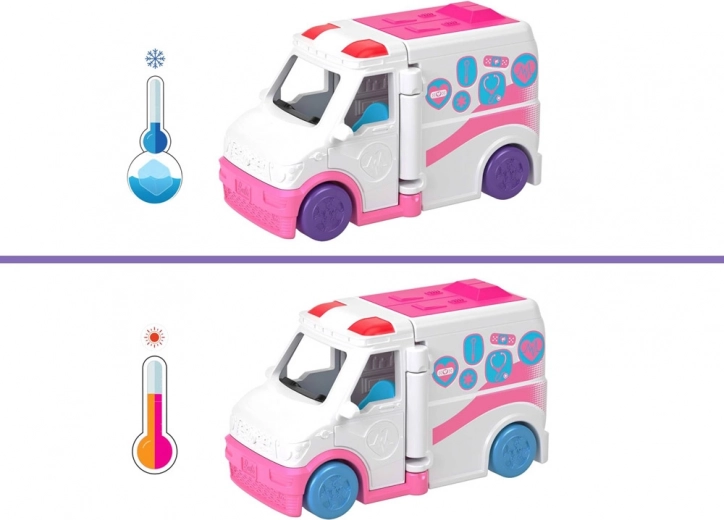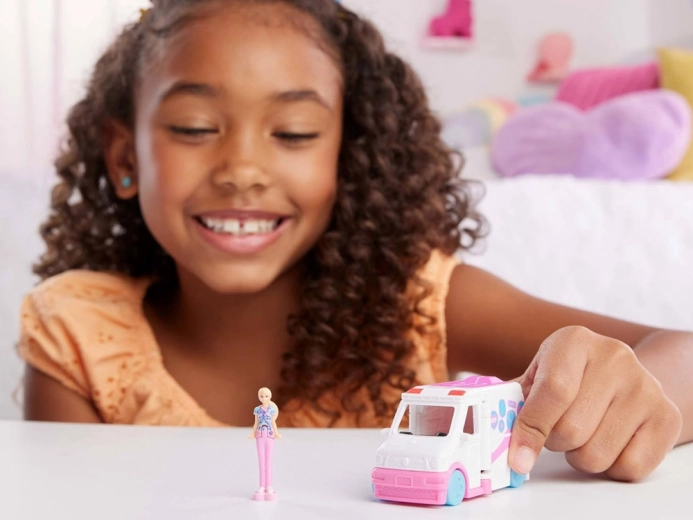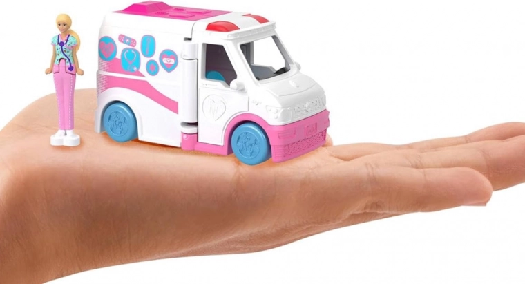 Deze mini-ambulance, geïnspireerd op de wereld van BARBIE, brengt groot speelplezier in een klein formaat. Na het openen verandert het voertuig in een kleine kliniek, waar de minipop voor patiënten kan zorgen, op de draaistoel kan zitten en eigen reddingsverhalen kan verzinnen. Dankzij de compacte afmetingen is de set perfect voor thuis en onderweg.
