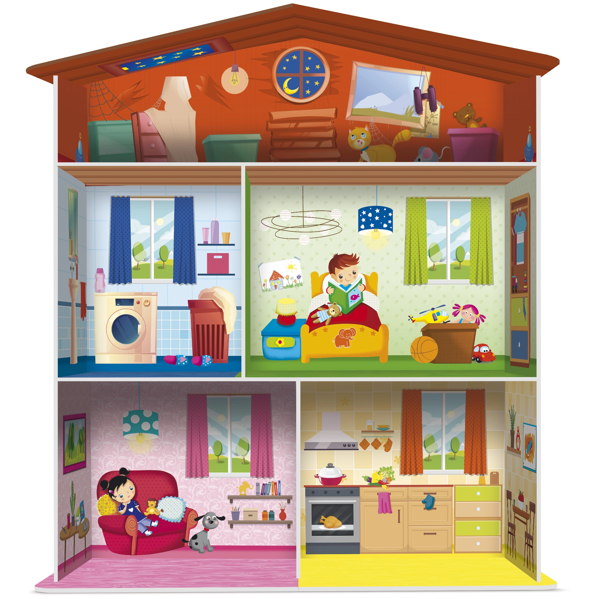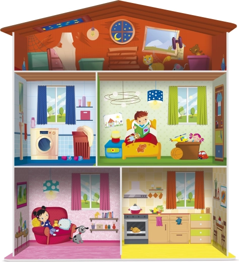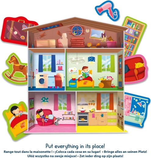 De set bevat een huisje, puzzels in de vorm van huiselijke inrichting en 15 kaarthouders, waarmee de elementen overzichtelijk kunnen worden neergezet of gebruikt voor verschillende speelscenario’s. Een geweldige keuze voor kinderen vanaf 3 jaar, die leren sorteren, benoemen en hun eigen verhalen creëren.