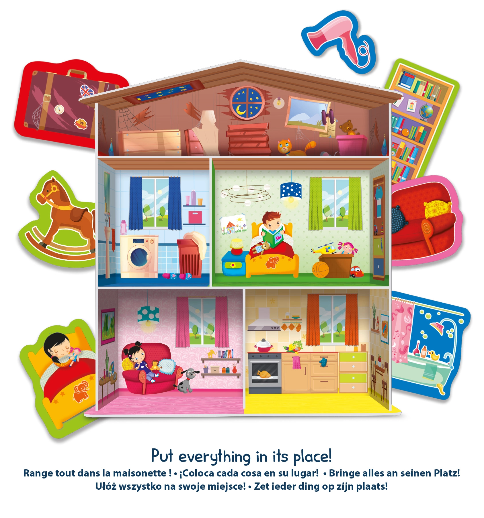 Ontdek een leuk educatief spel voor de allerkleinsten: het Montessori spel Mijn thuis ontwikkelt de fijne motoriek, logica en verbeeldingskracht. Kinderen bouwen hun eigen huisje en plaatsen de inrichting als een puzzel. Bevordert zelfstandigheid, ruimtelijk inzicht en creatief spel.