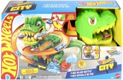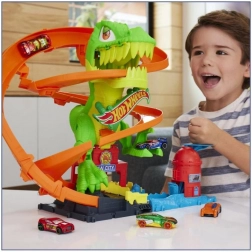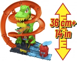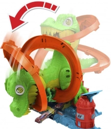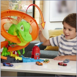 Maak je klaar voor een spannende rit in Hot Wheels City! Laat het meegeleverde metalen 1:64‑autootje los en race langs de T‑rex. Elke keer dat de auto passeert, draaien de ogen van de dinosaurus, tot hij uiteindelijk wordt verslagen. Kinderen kunnen verschillende scenario’s proberen – van snel “tanken” tot een heroïsche overwinning die de hele stad redt.