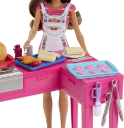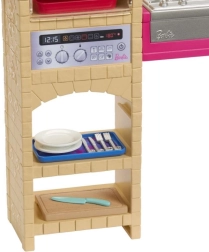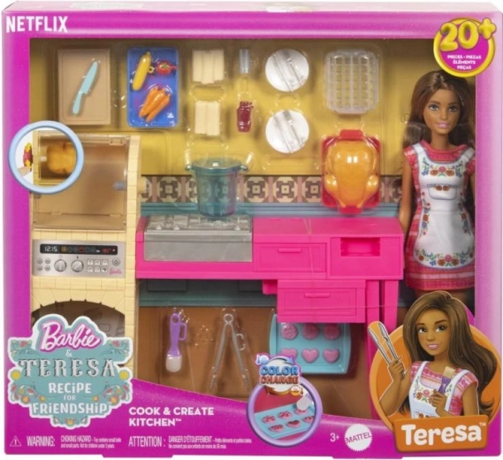 Deze betoverende keukenset met pop Teresa brengt realistisch koken in BARBIE-formaat naar kinderen. Dankzij de uitgebreide uitrusting en interactieve elementen, zoals een functionele oven met draaiknop en “bakken” van koekjes met kleureffect, ontstaan leuke scenario’s van deeg bereiden tot serveren.
