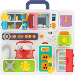 Het interactieve keukenscherm Huanger is uitgerust met functies zoals een open koelkast, een fornuis met knoppen, een magnetron met timer en aansluitingen voor het aansluiten van apparaten. Deze elementen bieden onbeperkt plezier en stimuleren de zintuiglijke ontwikkeling van het kind. Het speelgoed stelt kinderen in staat om realistische scenario's na te spelen, zoals het wassen van producten, het bewaren ervan in de koelkast en het opwarmen in de magnetron.