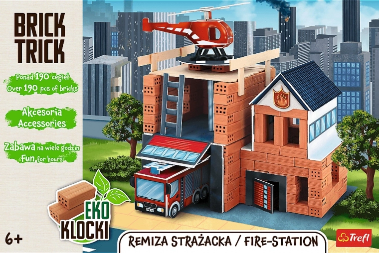 Bouw een brandweerkazerne XL van kleistenen en hout. 190+ onderdelen, in water oplosbare lijm, accessoires en handleiding. BRICK TRICK van TREFL, vanaf 6 jaar.