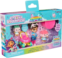 Betreed de wereld van Gabby’s Dollhouse met de schattige Kitty Care figuurspeelset. De set bevat een Gabby-figuur met kattenoortjes, twee kattige vriendjes en een kleurrijke kinderwagen in de vorm van een donut met vrij draaiende wielen. Inclusief een verrassingscapsule en gedetailleerde accessoires voor creatief spel en zorg voor de katvriendjes.
