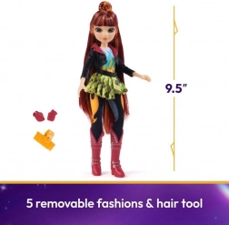 Betreed de wereld van de Eenhoorn Academie met deze 23 cm hoge pop, geïnspireerd door de animatieserie en het geliefde boek. Pop Valentina is in detail uitgewerkt en haar speelse persoonlijkheid komt tot uiting in haar rode, oranje en gele haar, dat je kunt kammen met de bijgeleverde accessoires. Ze draagt een stijlvol ruiterkostuum met een zwarte ruiterjas, een geruite rok, rijbroeken met het teken Vuurmagie, rode laarzen met metalen studs en rijhandschoenen.