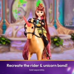 Vlammetje is uitgerust met afneembare tuigjes en zadel voor poppen, wat extra speelmogelijkheden biedt. Door een zachte beweging van zijn hoofd komt zijn persoonlijkheid tot leven en herbeleef je de magische ervaring van de band tussen een eenhoorn en rijder met Valentina.