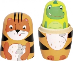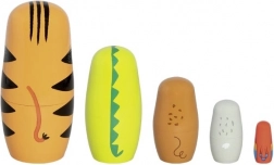 Deze originele set van 5 houten matroesjka’s in de vorm van exotische dieren (tijger, krokodil, aapje, koala en vogel) brengt kinderen plezier in het ontdekken van maten en bij het stapelen. Elk figuurtje is zorgvuldig beschilderd, ligt prettig in de hand en is dankzij het gladde oppervlak eenvoudig te openen en te sluiten.