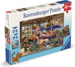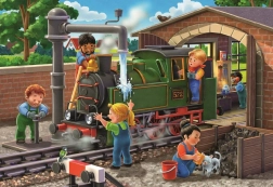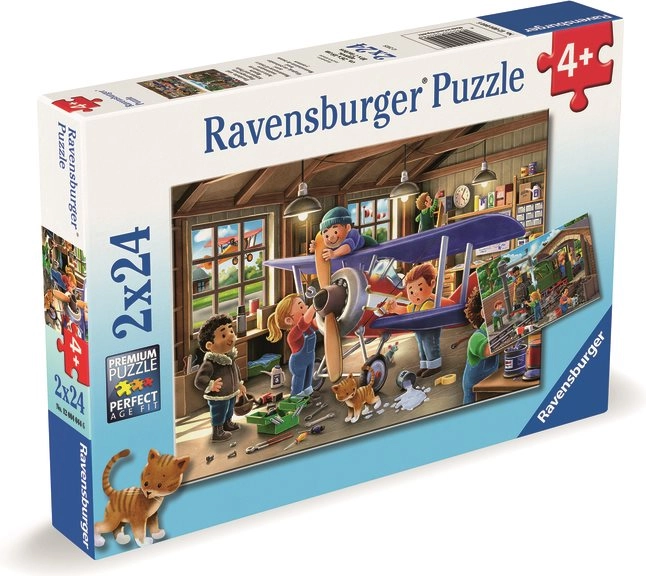 Deze dubbele puzzelset voor kinderen combineert leren en plezier in één. Kinderen genieten van het leggen van twee scènes vol details: in de werkplaats wordt een modelvliegtuig gebouwd en in het depot wordt voor een stoomlocomotief gezorgd. De hoogwaardige stukjes van Ravensburger passen perfect, zijn duurzaam en afgestemd op kleine kinderhanden.