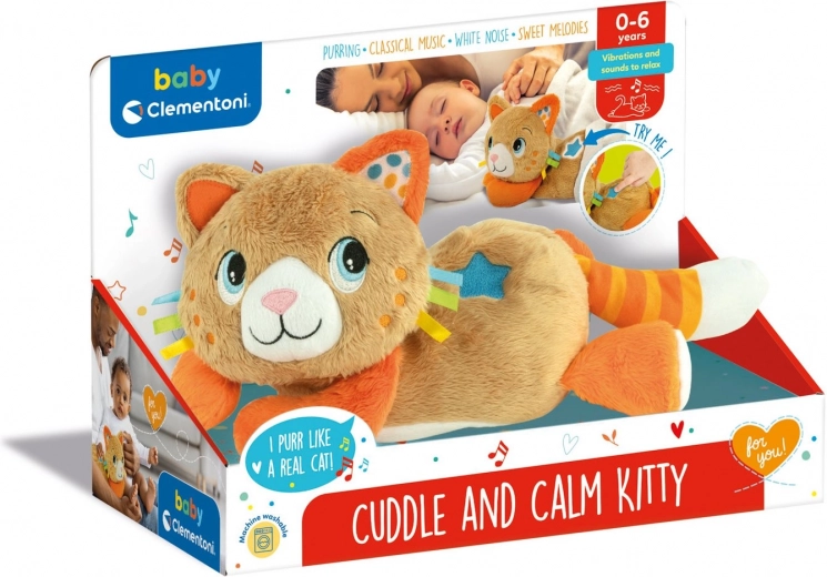Zacht pluchen katje van CLEMENTONI BABY met vibraties, muziek en witte ruis voor rustig inslapen. Wasbaar op 30 °C, inclusief demonstratiebatterijen.