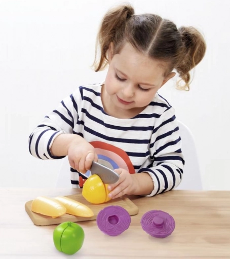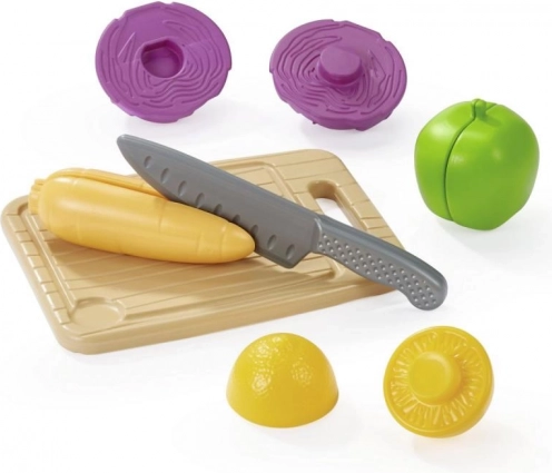 Maak kennis met de kunst van snijden en koken met deze aantrekkelijke en kleurrijke speelgoedset. Dankzij de kleurrijke en diverse selectie van plastic groenten kunnen kinderen talloze spellen en verhalen bedenken, hun creativiteit en fijne motoriek ontwikkelen. De set bevat een plank, een mes en verschillende soorten fruit en groenten, zoals een appel, maïs en kool. Stimuleer de kinderlijke verbeelding en leer ze de basis kookvaardigheden.