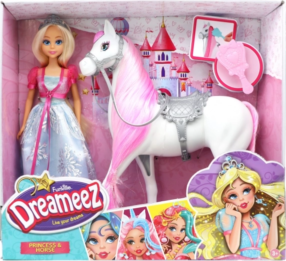 Ontdek de betoverende set prinses met paard van DREAMEEZ – een pop van ongeveer 29 cm hoog in een prachtige jurk met kroon en een schattig paardje met manen. Ideaal voor sprookjesspel, fantasieontwikkeling en fijne motoriek bij het kammen en verzorgen van de manen.