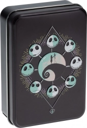 Zwart metalen blik met een motief van Jack Skellington en Sally, ideaal voor opslag en houdt je kaarten veilig.