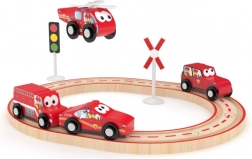 De verpakking bevat 16 onderdelen, waaronder houten rails en voertuigen met brandweermotieven. Kinderen kunnen eigen trajecten bouwen en verhalen bedenken die hun fantasie en sociale vaardigheden ontwikkelen.