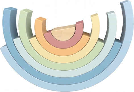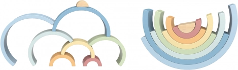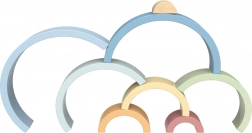 De set bevat 8 halfronde delen in verschillende maten en zachte kleuren, die je kunt stapelen tot een regenboog, bruggen, tunnels en fantasiebouwwerken.