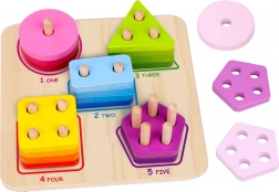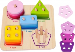 Kinderen sorteren gekleurde vormen op de juiste pinnen en leren daarbij tellen van 1–5 en de Engelse namen van vormen herkennen op de basis.