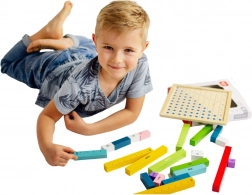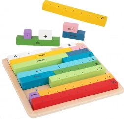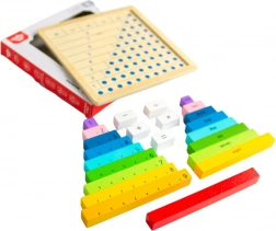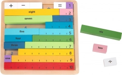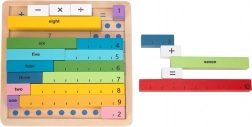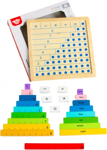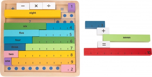 Deze educatieve set combineert gekleurde houten stukjes met cijfers en tekens met een praktische houten plaat. Kinderen begrijpen snel de relaties tussen cijfers en eenvoudige rekenkundige bewerkingen dankzij het leggen van sommen en de visuele demonstratie.